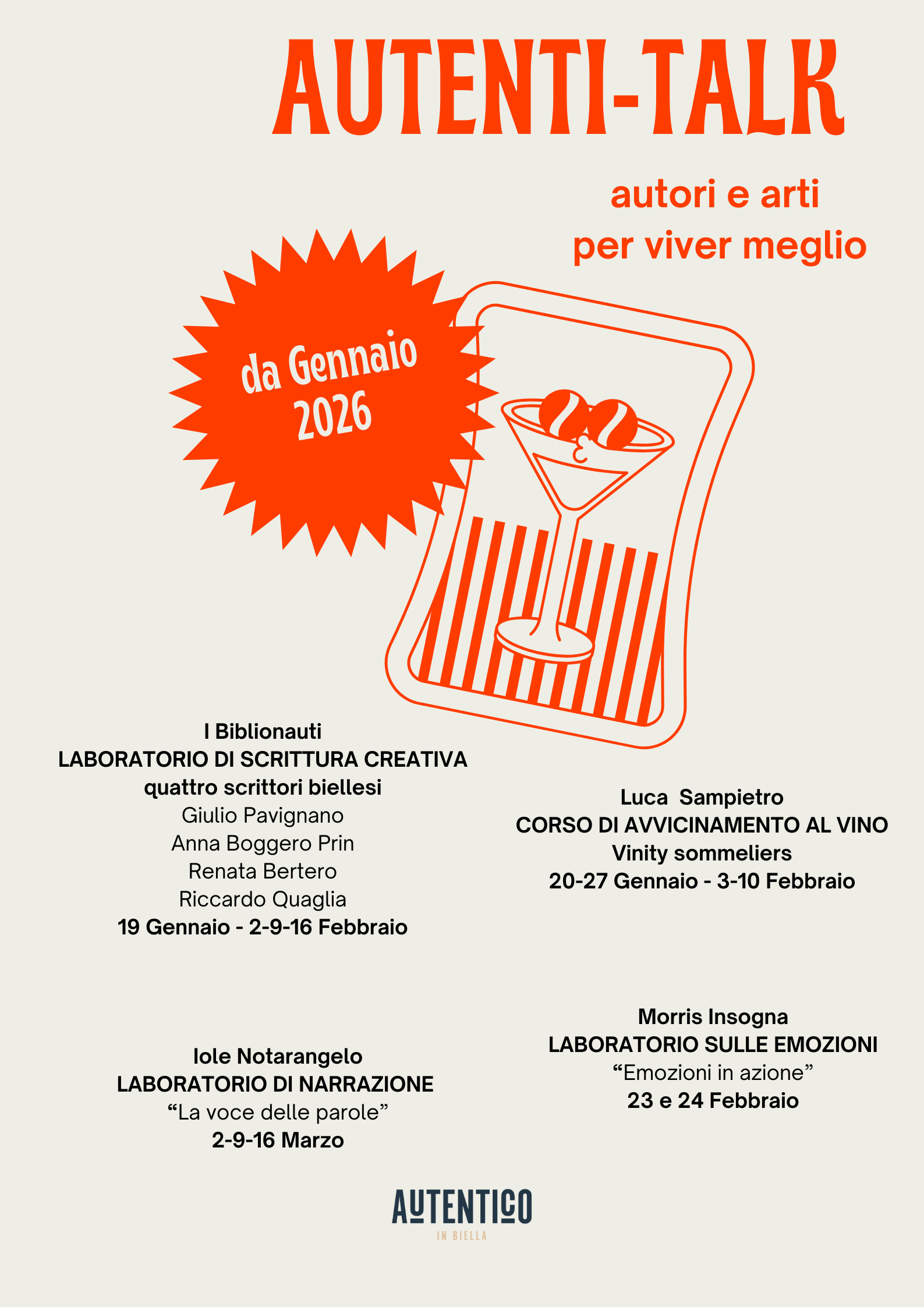 Un momento da non perdere per chi si vuole avvicinare all’avventura della scrittura: una serata per scoprire il non-manuale “Nell’universo delle parole”, incontrare i Biblionauti e dare il via al proprio viaggio creativo. Renata Bertero, Anna Boggiero Prin, Giulio Pavignano e Riccardo Quaglia sono i quattro autori biellesi che presenteranno questo agile strumento per avvicinarsi alla scrittura creativa in modo semplice ed efficace, ognuno con il proprio approccio, i propri dubbi, le proprie difficolta e i propri strumenti: una ricchezza che emerge proprio grazie alle differenze individuali. Vi aspettiamo alle 19.30 di Lunedì 19 Gennaio presso Autentico. Consumazione libera e non obbligatoria. Prenotazione posti suggerita. Segue il corso con i quattro temerari autori biellesi che si adopereranno per ispirarvi e accompagnarvi nella preparazione di un elaborato nelle serate di Lunedì 2-9 e 16 Febbraio…e tu di che penna sei? Il corso è collegato all’acquisto del libro.